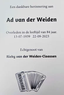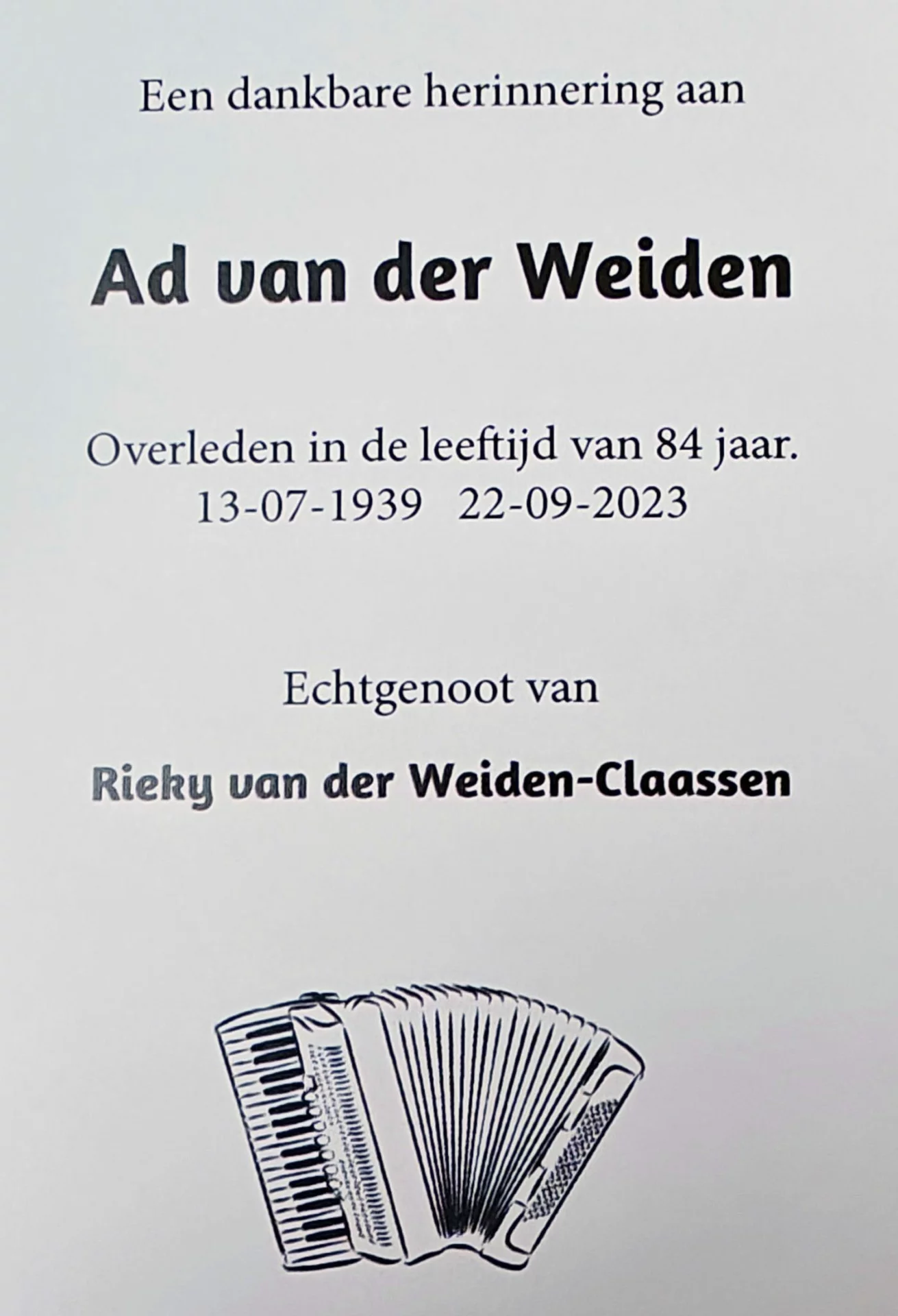 Op 22 September 2023 is onze accordeonist Ad van der Weiden overleden. Ad was een verenigingsman in hart en nieren, alles voor de club. Altijd met humor en wijze raad. We missen hem enorm.